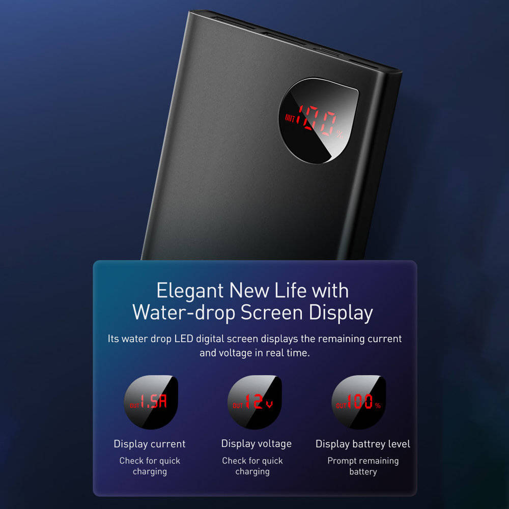 The Baseus 10000mAh 22.5W Adaman Metal Digital Display Power Bank is a compact and powerful portable charger designed to keep your devices powered up on the go.